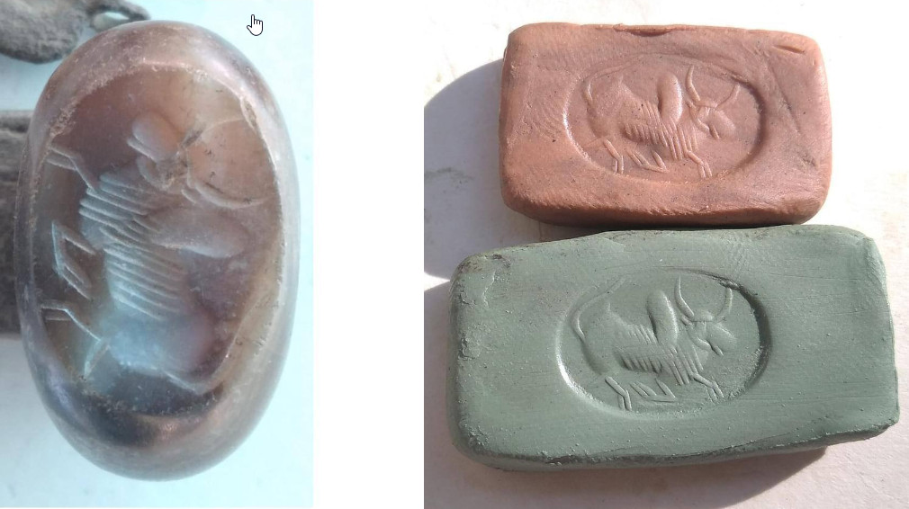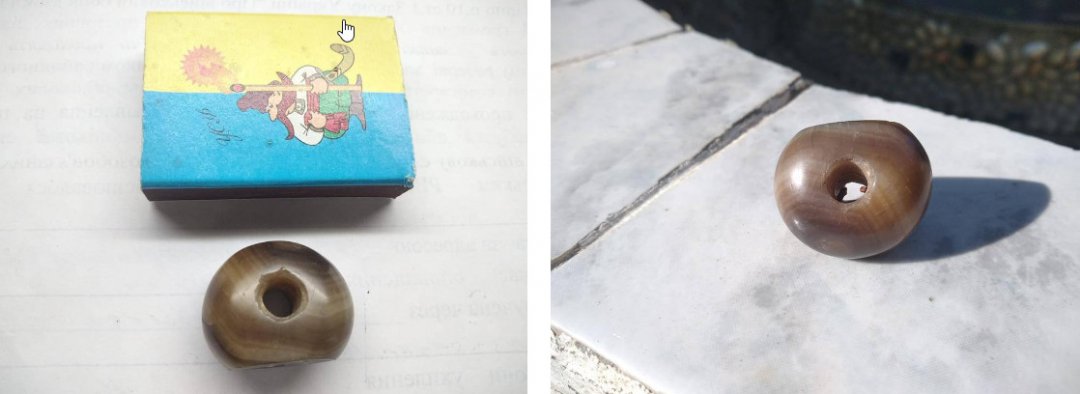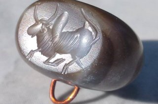 Итак, при исследовании несуществующего поселения, среди пашни, мужчина визуально заметил вещь из интересного камня со сколом. Сначала по мнению Олега Курносова пришло, что это черняховская бусина, которая сколотилась под плугом. Однако очистив и рассмотрев находку, он выяснил, что отверстие оказалось большего диаметра, а вместо скола увидел задуманную гему с изображением бизона или какая.