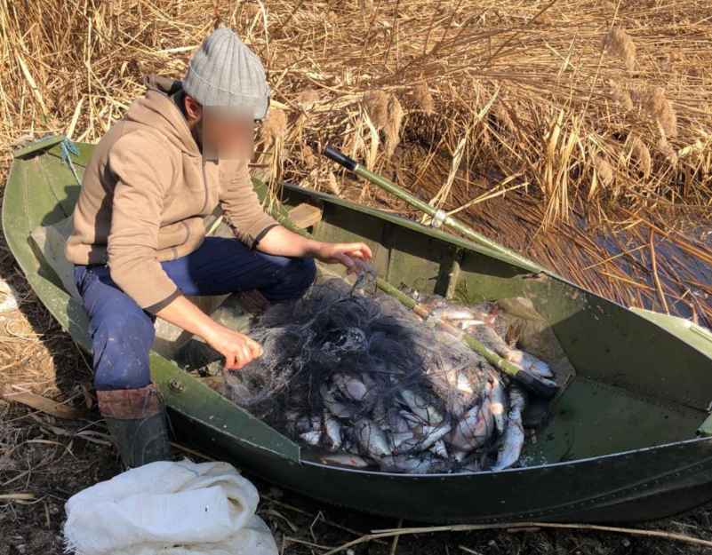 Браконьер с помощью 3 сеток и используя лодку выловил 250 особей рыбы: тарани, судаков, плоскирок, щук, белья, карасей.