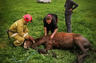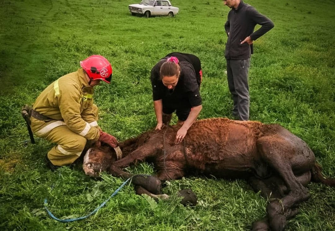 Спасатели с помощью веревки и пожарного автомобиля достали лошадь из болотной ловушки. Животное не пострадало.