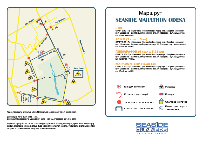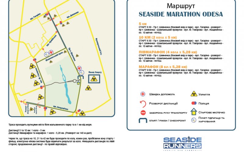 Трасса будет проходить по улицам города возле парка Победы, в километре от моря. Старт марафона состоится в 08:30 по просп. Шевченко, финишной точкой для бегунов указана площадь 10 апреля.