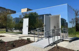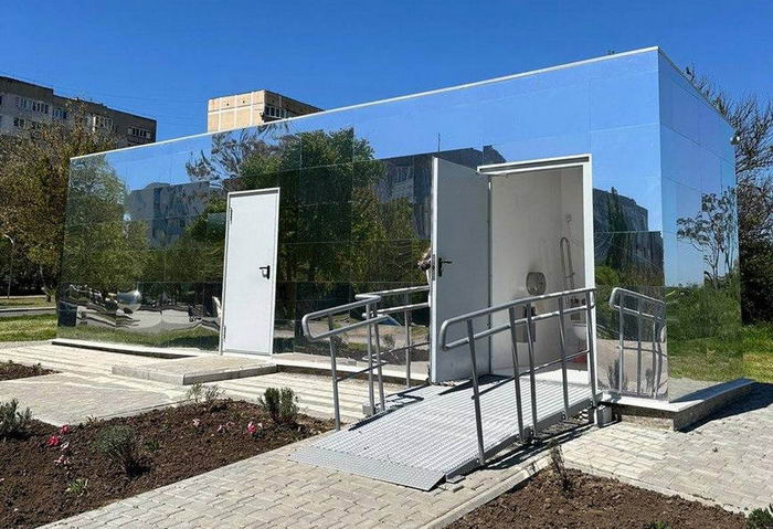 В городе Южное наконец-то через три года открыли зеркальный туалет, который построили за 2,9 млн. гривен. Он выглядит как обычный МАФ, размером с морской контейнер, который установили посреди поля. Все наружные стены у него облицованы квадратными зеркалами.