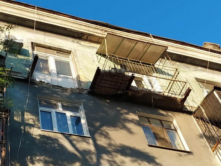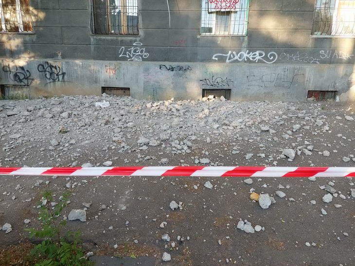 Сначала казалось, что здесь произошел обвал балкона. Но местные жители рассказали, что это был контролируемый демонтаж аварийного балкона. Не понятно только, почему два дня тротуар засыпан обломками, мешающими ходить. Отметим, что здание было построено в начале 1950-х годов, а балконы уже стали аварийными.