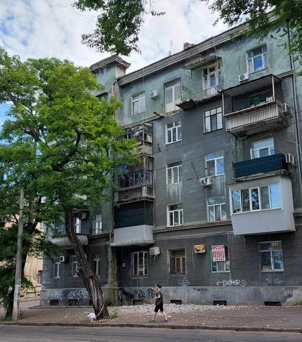В центре Одессы по улице Старопортофранковской тротуар засыпало бетонными обломками от балкона на 5 этаже. Их было так много, что пройти по тротуару не было возможности и пешеходам пришлось выходить на дорогу, чтобы обойти опасное место.