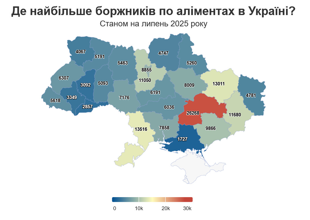 Вместе с тем, в некоторых регионах наблюдается снижение. Так, в Херсонской области количество алиментных производств сократилось в 6,4 раза — с 11 139 до 1 727, что может быть связано с частичной эвакуацией населения, изменением административного контроля и сложностями в ведении реестров в условиях боевых действий. В целом, рост числа долгов зафиксирован в 19 регионах Украины, тогда как в шести — зафиксировано снижение.