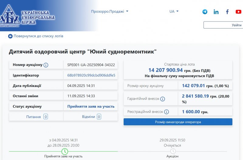 Отдельно отмечается, что земельные участки, на которых расположен «Юный судоремонтник», не являются предметом купли-продажи. Новому собственнику после приобретения имущества предстоит самостоятельно урегулировать вопрос землепользования в порядке, установленном действующим законодательством Украины. Стартовая цена объекта приватизации установлена на уровне 14 207 901 гривны. Торги запланированы на 29 сентября. Ключевым обязательством для будущего владельца, согласно условиям аукциона, является сохранение текущего профиля деятельности объекта – детского оздоровительного центра.