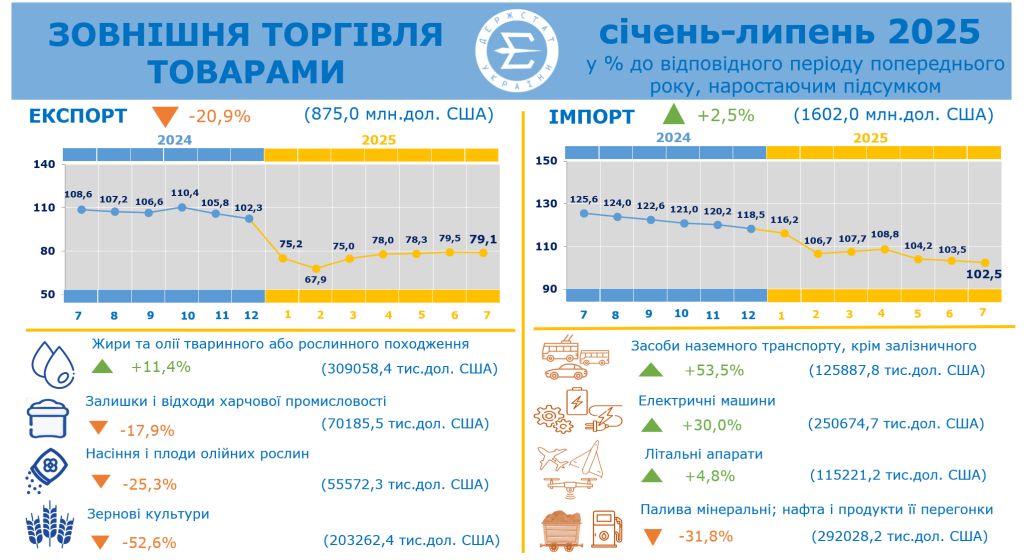 За первые семь месяцев 2025 года предприятия Одесской области активно вели торговлю с более чем 160 странами мира, демонстрируя значительную внешнеэкономическую активность. Согласно данным Главного управления статистики в Одесской области, объем экспорта региона составил около 875 миллионов долларов США, что на 20% ниже показателей аналогичного периода прошлого года. В то же время импорт вырос до 1,6 миллиарда долларов, что привело к отрицательному торговому балансу в размере 727 миллионов долларов.