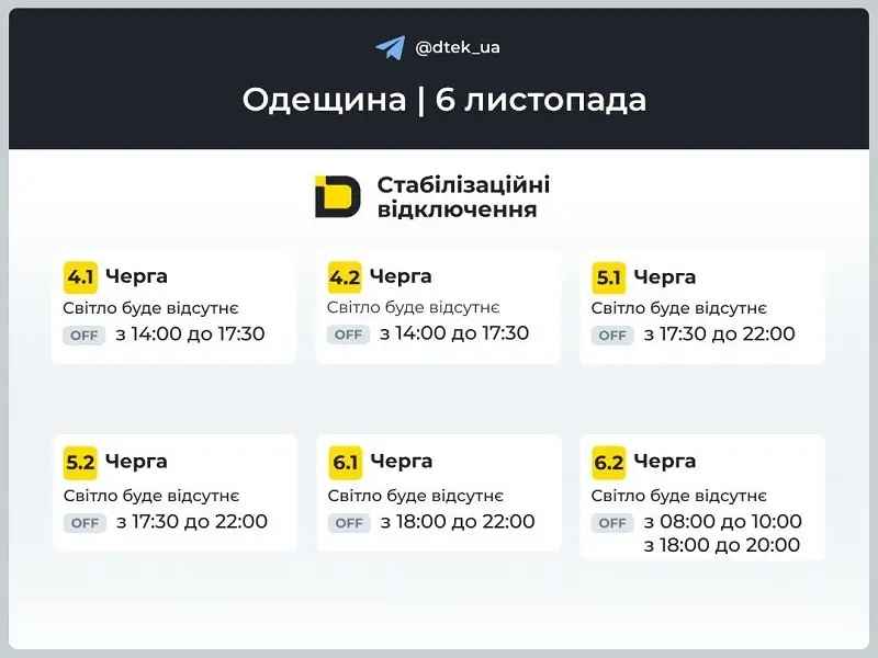 В четверг, 6 ноября 2025 года, жителей Одессы и Одесской области ожидают стабилизационные отключения электроэнергии. Соответствующее распоряжение поступило от компании-оператора энергосистемы «Укрэнерго», о чем проинформировал местный дистрибутор — компания ДТЭК «Одесские электросети».