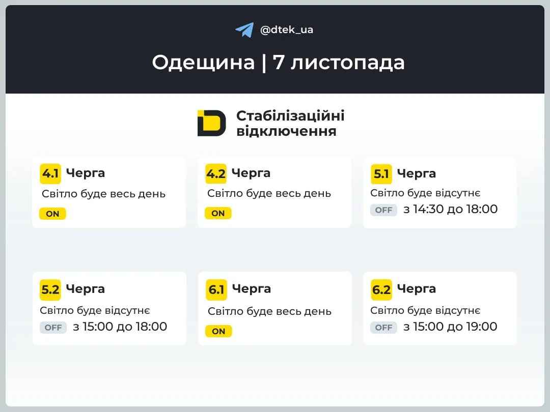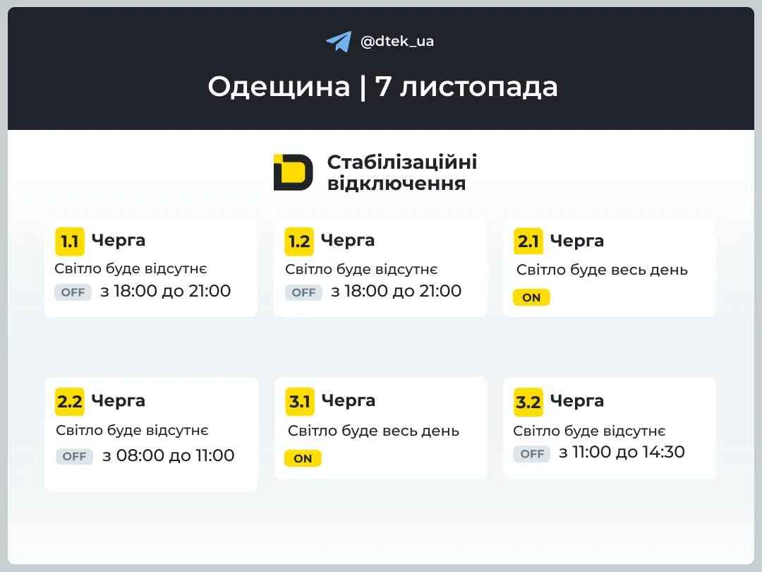 В пятницу, 7 ноября, жителей Одессы и области ожидают плановые стабилизационные отключения электроэнергии. Согласно официальной информации от оператора распределительной сети, в регионе будут действовать двенадцать очередей обесточивания. Подача электричества будет приостанавливаться в течение всех суток согласно заранее составленным и опубликованным графикам.