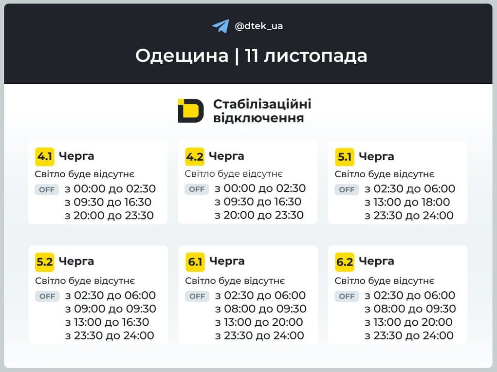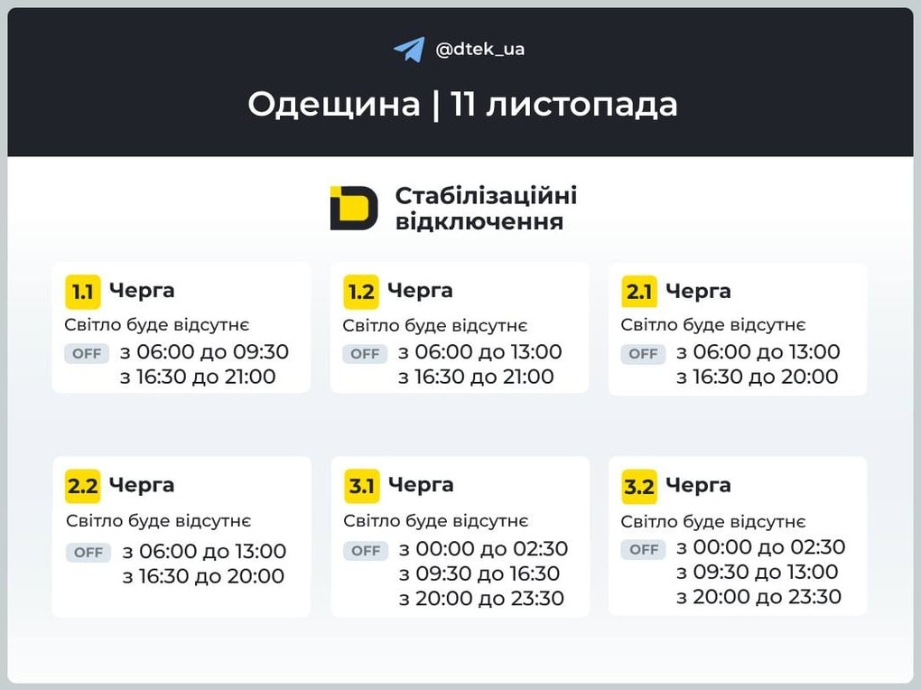 Отсутствие официальных сообщений от оператора системы «Укрэнерго» и распределительного оператора «ДТЭК» лишь подтверждает сложность текущей ситуации в энергосистеме. Согласно имеющейся информации, во вторник, 11 ноября, с 00:00 до 23:59 по всей стране, включая Одесскую область, будут действовать графики почасовых отключений. Объем отключений составит от 2 до 3,5 очередей, что связано с необходимостью балансировки энергосистемы после массированных ракетно-дронных атак противника.