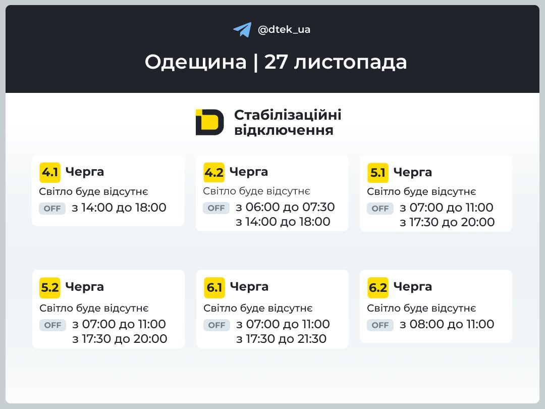 В четверг, 27 ноября, жители Одессы и Одесской области, как и большинства других регионов Украины, столкнутся с плановыми почасовыми отключениями электроэнергии. Об этом стало известно из официального сообщения национального оператора «Укрэнерго».