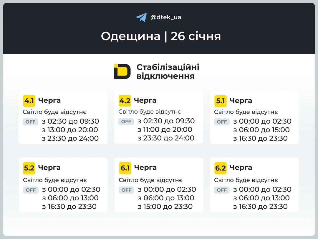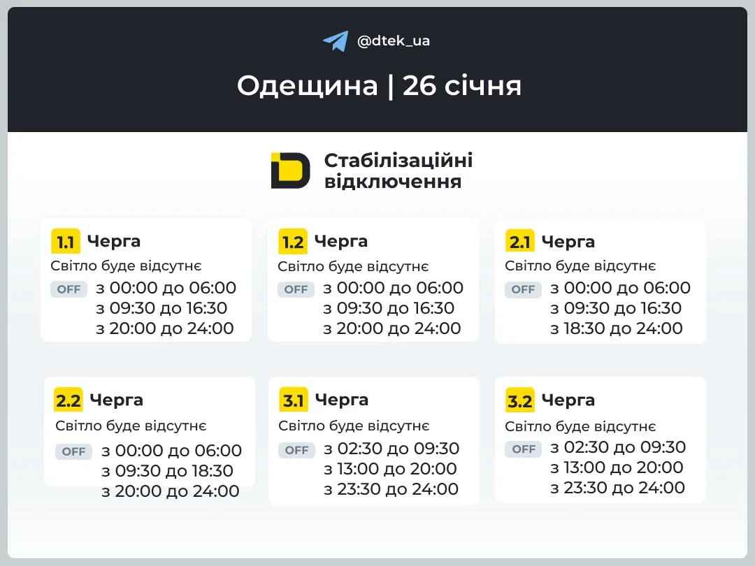 В понедельник, 26 января 2026 года, по всей Украине будут действовать почасовые графики ограничения потребления электроэнергии из-за продолжающихся повреждений энергообъектов. В Одесской области ситуация остаётся особенно сложной: стабилизационные графики применяются только на участках с технически исправными сетями, а в Одессе и большинстве районов области свет выключают в аварийном режиме — внезапно и без предварительного предупреждения. Об этом сообщили на официальном сайте НЭК «Укрэнерго» и в пресс-службе ДТЭК Одесские электросети.