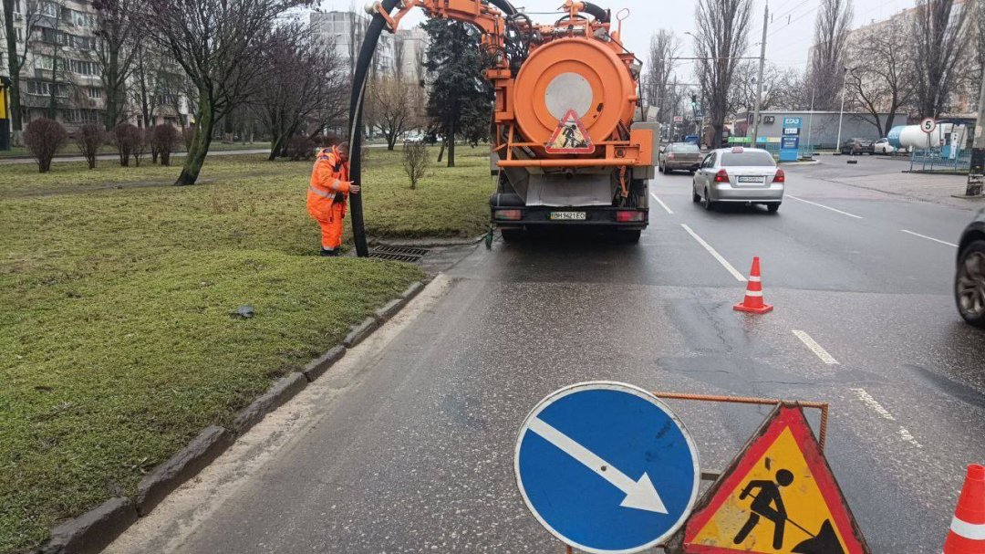 очистка водосточных систем на улице Академика Вильямса и проспекте Небесной Сотни;