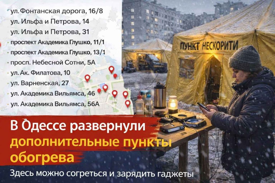 В Одессе продолжают разворачивать дополнительные пункты обогрева и помощи населению в связи с длительными отключениями электроснабжения. Как сообщили в Одесском городском совете, спасатели ГСЧС установили еще 10 мобильных палаток, где жители могут согреться, зарядить гаджеты и получить горячие напитки.