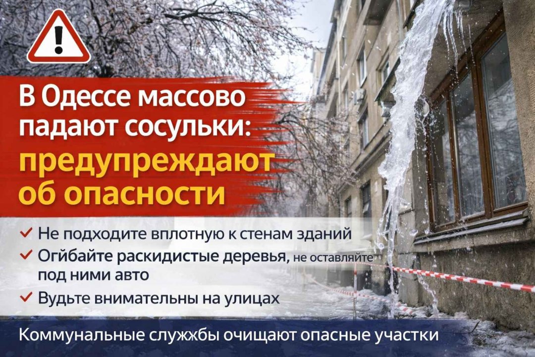После продолжительного периода снегопадов, дождей и морозов в Одессу пришло долгожданное потепление. Однако установившаяся днем плюсовая температура принесла с собой новые опасности. Как сообщили представители жилищно-коммунальных служб, на карнизах домов начали массово образовываться и падать сосульки. Кроме того, деревья, которые в предыдущие дни были покрыты плотной ледяной коркой, начали активно оттаивать, и крупные обломки льда падают вниз, создавая угрозу для прохожих и припаркованного транспорта.