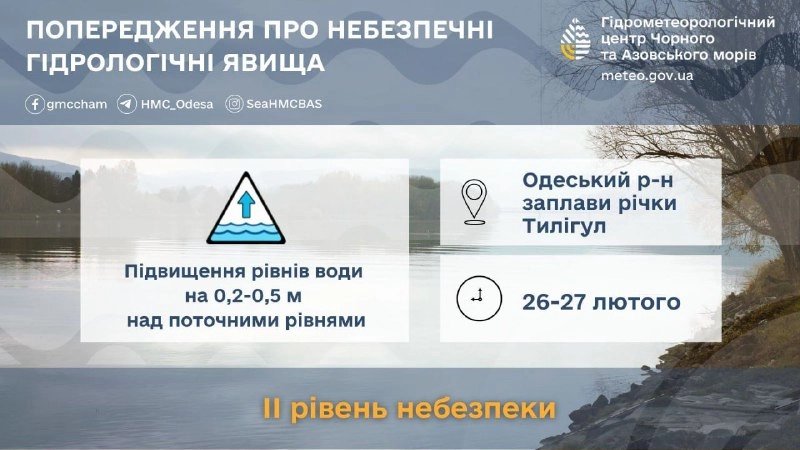 В Одесской области сохраняется угроза подтопления из-за активного таяния снега. По данным Укргидрометцентра Черного и Азовского морей, 26-27 февраля ожидается дальнейший подъем уровня воды в реке Тилигул. Синоптики объявили II уровень опасности (оранжевый).