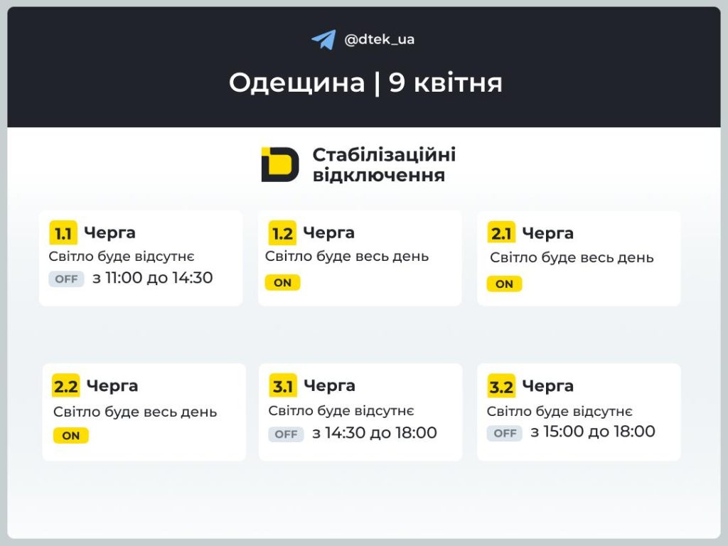 В Одессе и Одесской области 9 апреля 2026 года традиционно продолжается любимая жителями «энергетическая лотерея». ДТЭК Одесские сети, следуя лимитам НЭК «Укрэнерго», снова раздал всем по очереди 1.1–6.2. Большинству повезёт остаться без света один-два раза за день — настоящий подарок четвергу.