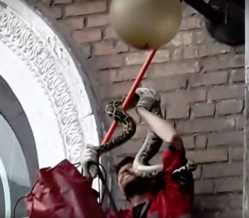"Прибывший спасатель снял тигрового питона (длиной около 2 метров) с фонаря при помощи телескопической палки. О факте снятия питона уведомлена полиция. В настоящий момент питон передан частному специалисту на временное содержание", - сказано в сообщении.