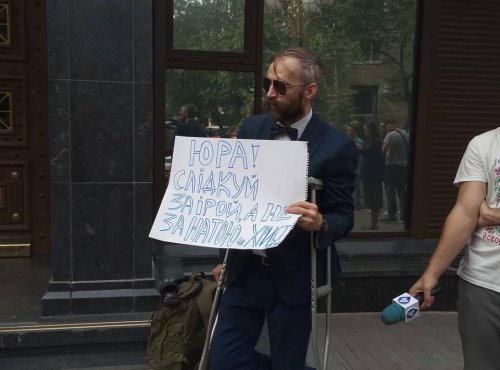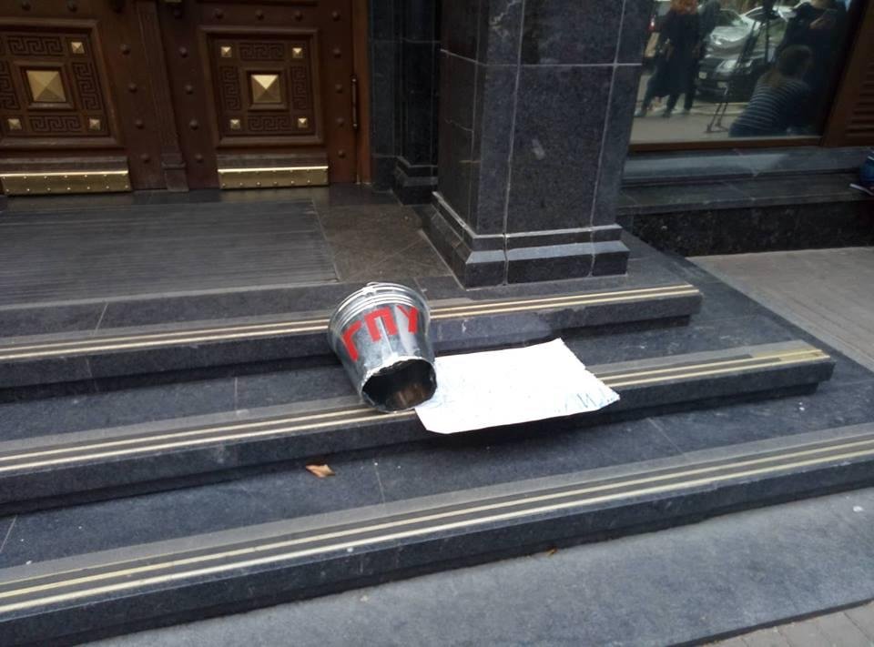 Также активисты принесли самодельный плакат с надписью: "Юра! Следи за Ирой, а не за Натой или Христей". После завершения акции дырявое ведро оставили в подарок генпрокурору на ступеньках.