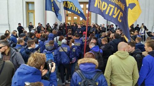 Акцию организовали представители "Нацкорпуса". Около министерства собрались более 100 человек. При этом рядом находится около 50 полицейских, которые охраняют общественный порядок.