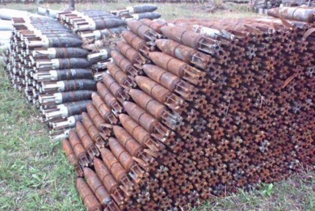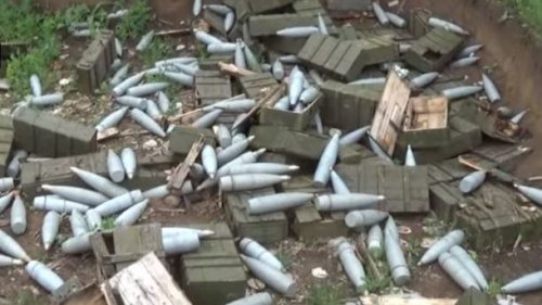 Снаряды сложены прямо на земле и совершенно не пригодны для использования, а ящики с патронами полусгнившие.