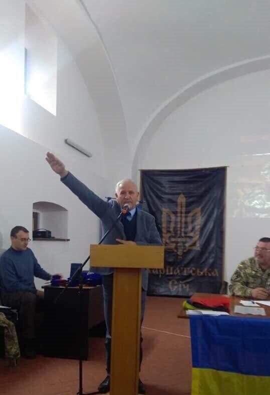 "Экс-консул Украины в Гамбурге Василий Марущинец приветствует собравшихся на праздновании четвёртой годовщины батальона "Карпатська січ", - подписал он фото.