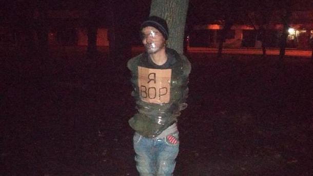 В Харькове на улице Большая Панасовская к дереву привязали мужчину с табличкой «Я вор» на груди. Как сообщили в Facebook-сообществе Харьков 1654, инцидент произошел вечером 4 ноября.