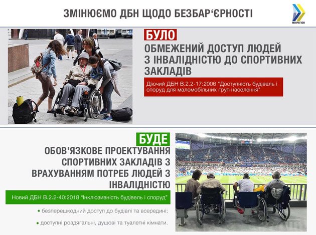 С весны 2019 года, спортивные заведения в Украине должны быть обустроены пандусами, табличками с обозначениями шрифтом Брайля и системами звукоусиления. Об этом идет речь в новых Государственный строительных нормах «Инклюзивность зданий и сооружений», пишет Юргила.