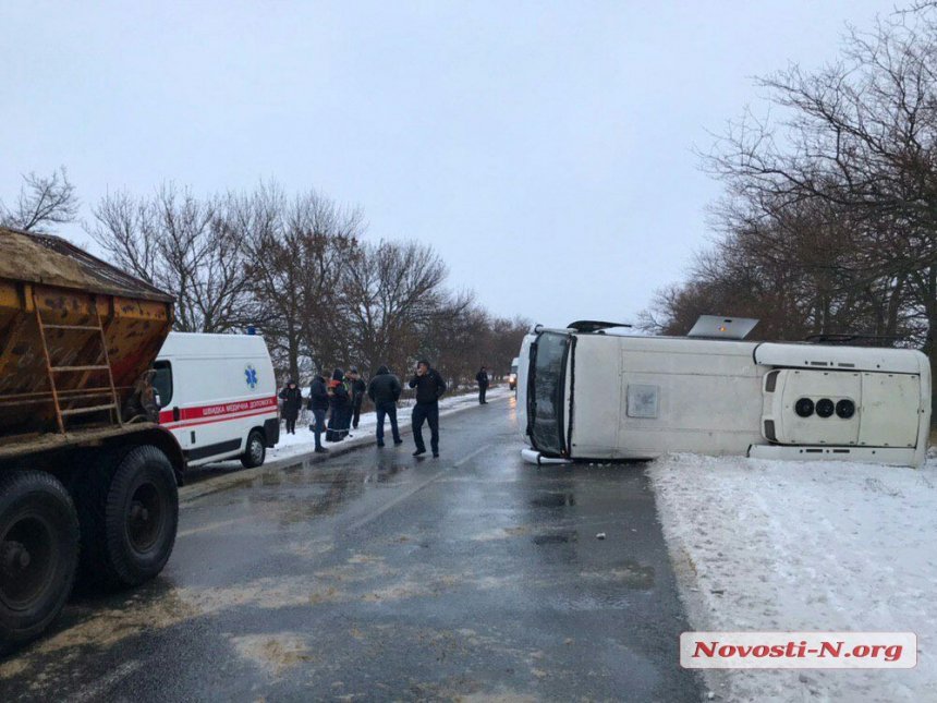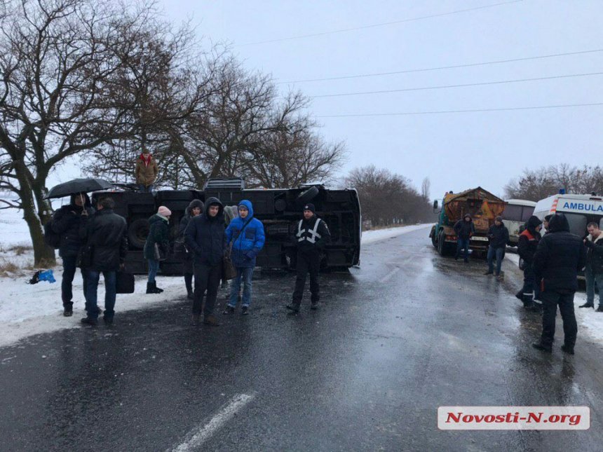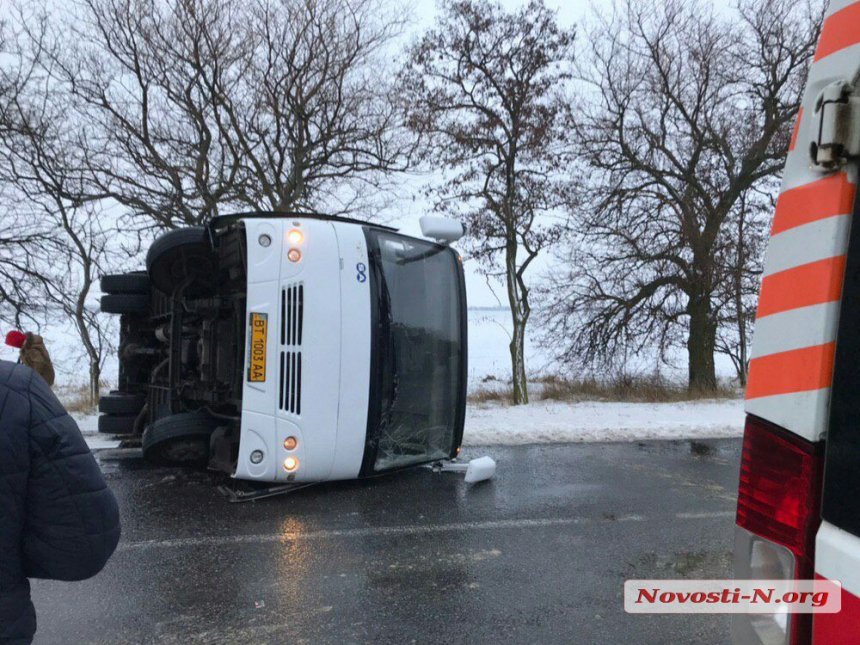 Автобус ехал по трассе, со стороны Николаева, в направлении Одессы. За селом Половинки, в условиях сильного гололеда, водитель не справился с управлением, автобус резко изменил траекторию движения и перевернулся.