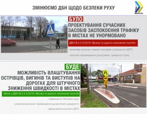 Государственные строительные нормы В.2.3-5: 2018 «Улицы и дороги населенных пунктов» вступили в действие с 1 сентября 2018 года. Они ввели ряд принципиально качественных изменений для безопасности и комфорта людей, в частности, возможность сужения ширины полос движения на дорогах, обязательное установление специальных защитных ограждений на остановках общественного транспорта, обязательное обустройство островков безопасности на нерегулируемых переходах, велодорожек и велополос и т.д.
