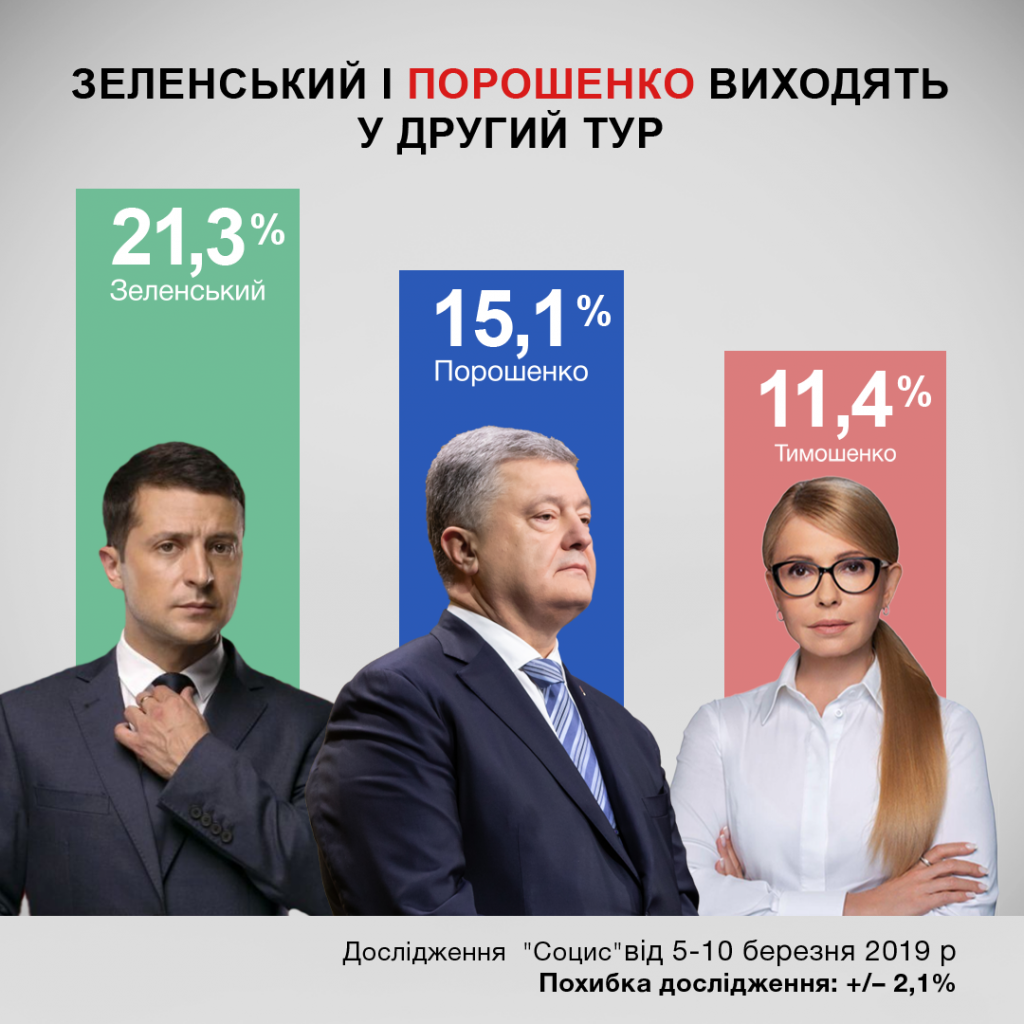 Наиболее вероятным победителем на президентских выборах респонденты считают П.Порошенко - 23,9%. Победу В.Зеленского прогнозируют 19,3% опрошенных, а Ю.Тимошенко -13,2%. В победу остальных кандидатов респонденты верят неохотно, ни один из кандидатов не получает показатели выше 3%.