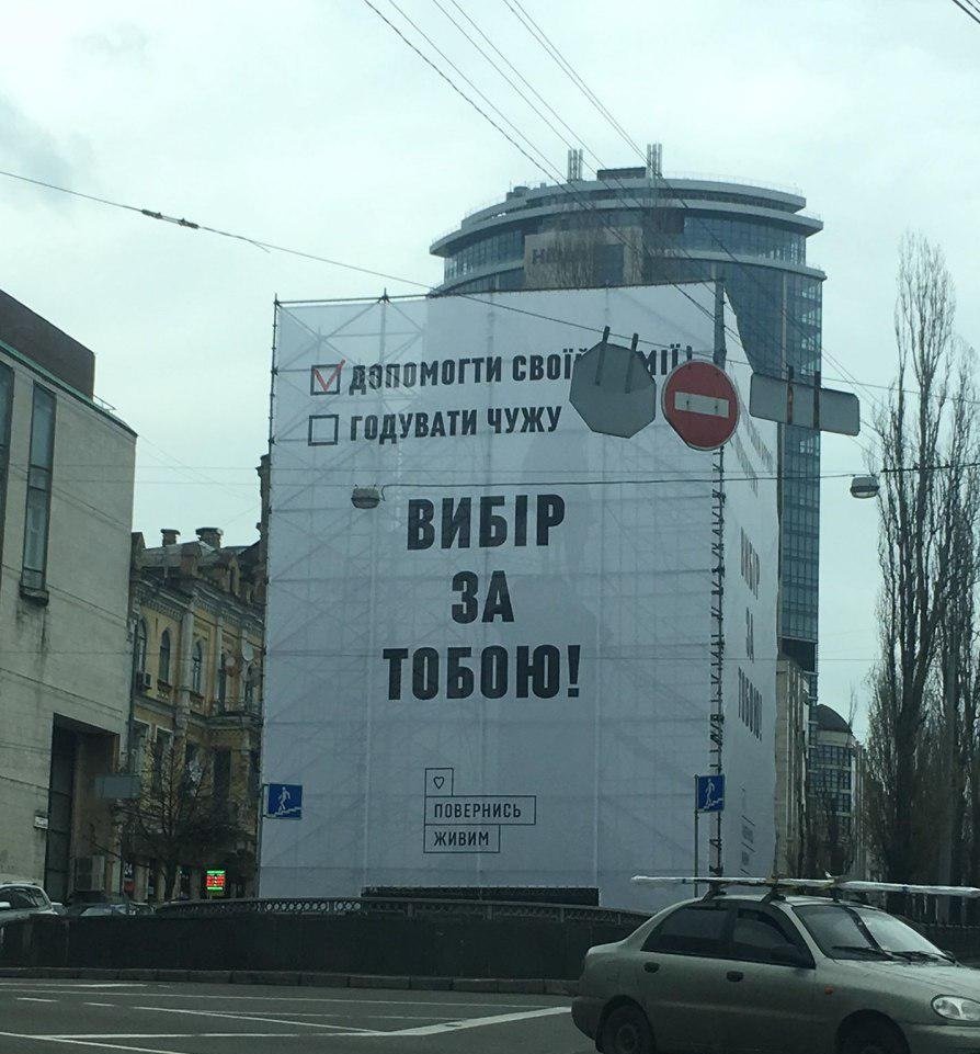 Так, на плакатах изображены пункты для голосования: «помогать своей армии» или «кормить чужую», при этом галочка стоит напротив первого пункта. Центральное место на плакате занимает слоган: «Выбор за тобой», внизу расположена подпись: «Повернись живим» и логотип. Они указывают на то, что установил баннеры одноименный благотворительный фонд, который существует в Украине с 2014 года.