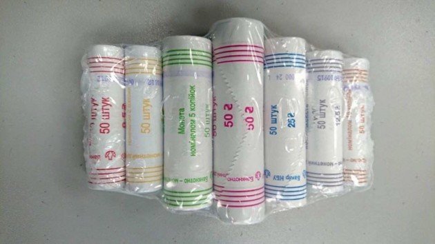 Комплект состоит из семи бумажных роликов с монетами номиналами 1, 2, 5, 10, 25, 50 копеек и 1 гривни. В каждом из них по 50 монет, они упакованы в термоусадочную пленку с бумажной этикеткой.