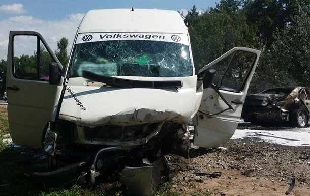 "Около 13.10 в полицию поступило сообщение о ДТП вблизи села Тетеревка Житомирского района. На автодороге столкнулись микроавтобус и автомобиль BMW... В результате столкновения легковой автомобиль загорелся", – говорится в сообщении.
