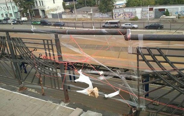 "После обращения киевлян об аварийном состоянии моста у Привокзальной площади коммунальщики отремонтировали его скотчем и нитками", - говорится в подписи к фото.