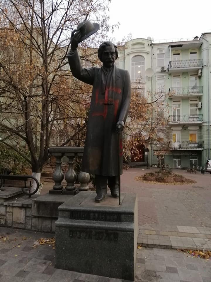 Предположительно сегодня ночью памятник классику еврейской литературы в г. Киеве Шолом Алейхему неизвестные разукрасили свастикой. Об этом сообщил главный рабин Украины Моше Реувен Асман на своей странице в Facebook.