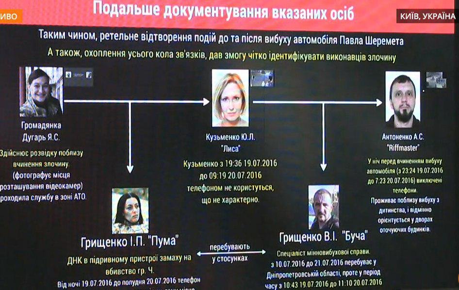 Инна Грищенко "Пума" - волонтер АТО, приобрела несколько автомобилей за время войны, решительна и целенаправленная, имеет явно выраженные лидерские качества в группе. Ее ДНК обнаружены в подрывном устройстве во время покушения на убийство гражданина Ч. С ночи 19 июля до полудня 20 июля также был выключен телефон.