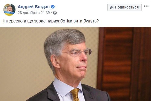 Глава посольства США в Украине Уильям Тейлор похвалил президента Украины Владимира Зеленского за то, что тот занимает более уверенную позицию в отношении президента РФ Владимира Путина, чем бывший президент Петр Порошенко. Прокомментировал это мнение на своей странице в Facebook глава Офиса президента Андрей Богдан.