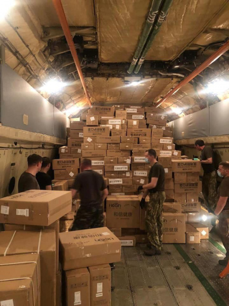 «Самолет Вооруженных сил Украины доставил два вида тестов: для ПЦР (полимеразной цепной реакции) и 250 000 тестов для экспресс-диагностики. Из Китая также доставлены медицинские маски, дезинфекторы, аппараты искусственной вентиляции легких и другие средства для борьбы с эпидемией Сovid-19.