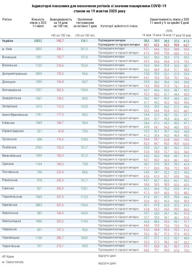 Так, во всех регионах Украины превышен показатель заболеваемости коронавирусом. В среднем по стране он составляет 192,7 при норме в 40. Самая плохая ситуация в Сумской (343,5), Хмельницкой (325,2) и Харьковской (307,6) областях. В Кировоградской области этот показатель составляет 43,8, в Киеве - 206,1.