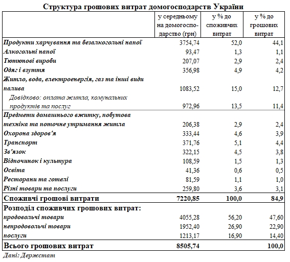 По данным статистического ведомства, в среднем за месяц на транспорт украинцы тратили 5,1% денег, на одежду и обувь - 4,9%, на здравоохранение - 4,6%, на связь - 4,5%, на табачные изделия - 2,9%, на предметы домашнего обихода, бытовую технику и текущее содержание жилья - 2,9%, на отдых и культуру - 1,5%, на алкоголь - 1,3%, на рестораны и гостиницы - 1,1%, на образование - 0,6%.