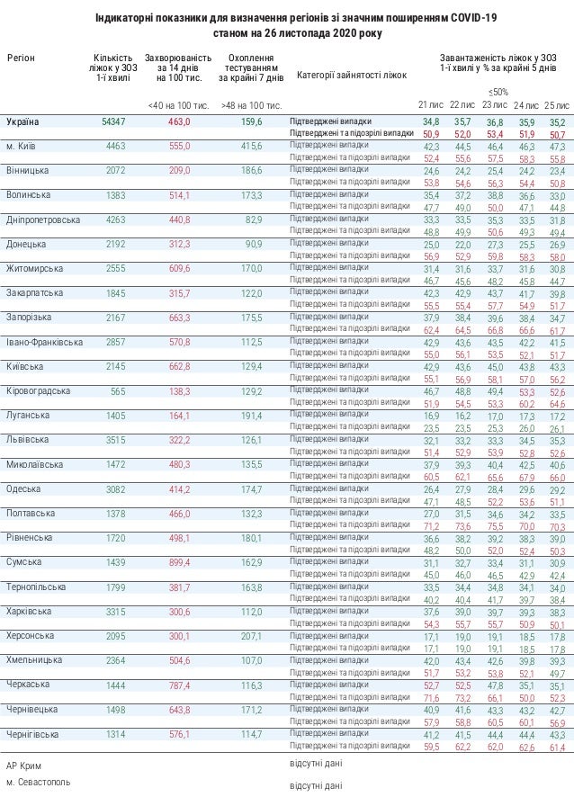Меньше всего заполнены больничные койки в Херсонской (17,8%), Луганской (26,1%), Тернопольской (38,4%), Сумской (42,4%) и Житомирской (44,7%) областях.