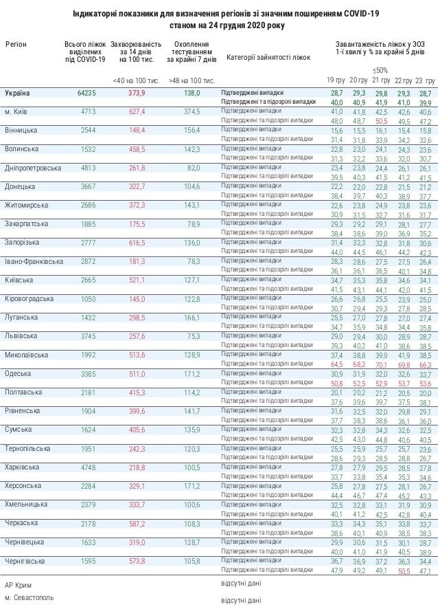 В Украине по состоянию на 24 декабря заняты 39,9% больничных коек для пациентов с коронавирусом. Всего введено 64 235 таких кроватей. Об этом свидетельствуют данные Министерства здравоохранения.