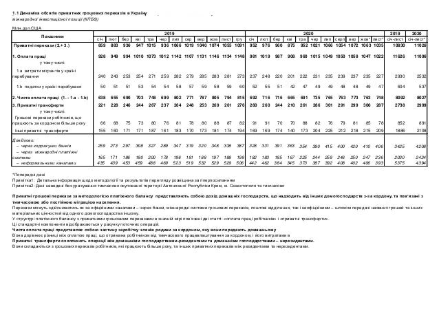 НБУ учитывал в своей статистике как официальные, так и неофициальные каналы поступления денег в Украину. В январе-ноябре 2020 года по неформальным каналам в Украину было переведено 4 394 млн долларов, что на 981 млн долларов меньше, чем за этот же период годом ранее (5 375 млн долларов).