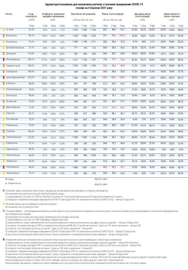 Так, по состоянию на 4 марта в "красной" зоне находятся Житомирская, Ивано-Франковская и Черновицкая области. "Оранжевыми" являются Винницкая, Донецкая, Закарпатская, Запорожская, Киевская, Львовская, Николаевская, Сумская и Тернопольская области.