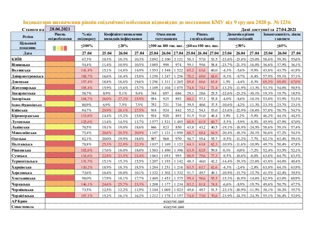 По состоянию на 28 апреля в Украине продолжают находиться 10 регионов в "красной" зоне: Киев, Житомирская, Запорожская, Киевская, Николаевская, Полтавская, Сумская, Харьковская, Хмельницкая и Черниговская области. "Желтыми" являются Закарпатская, Ивано-Франковская, Львовская, Одесская, Херсонская и Черновицкая области. Остальные находятся в "оранжевой" зоне.