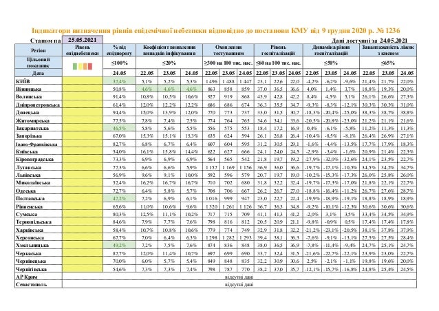 Таким образом, в Украине не осталось больше регионов, где был бы превышен хоть один показатель по COVID-19. При этом в пяти регионах показатели частично соответствуют "зеленой" зоне карантина. В Киеве, Закарпатской, Полтавской и Хмельницкой областях ниже процент от эпидпорога составляет менее 50%, а в Винницкой области - коэффициент выявления случаев инфицирования менее 5%.