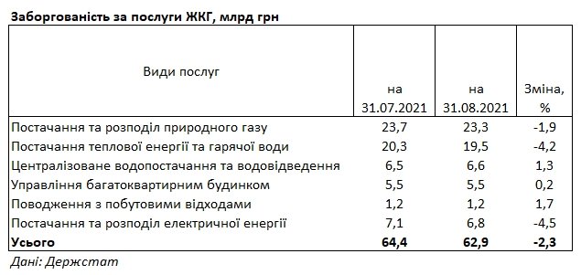 Задолженность населения по оплате жилищно-коммунальных услуг за август 2021 года сократилась на 1,5 млрд гривен. По состоянию на конец месяца долги составили 62,9 млрд гривен. Об этом сообщает Госстат.
