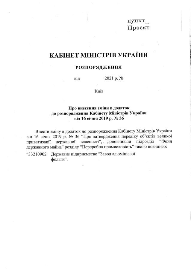 Кабинет министров Украины внес изменения в перечень объектов большой приватизации государственной собственности. Список дополнен "Заводом алюминиевой фольги" (Запорожье).