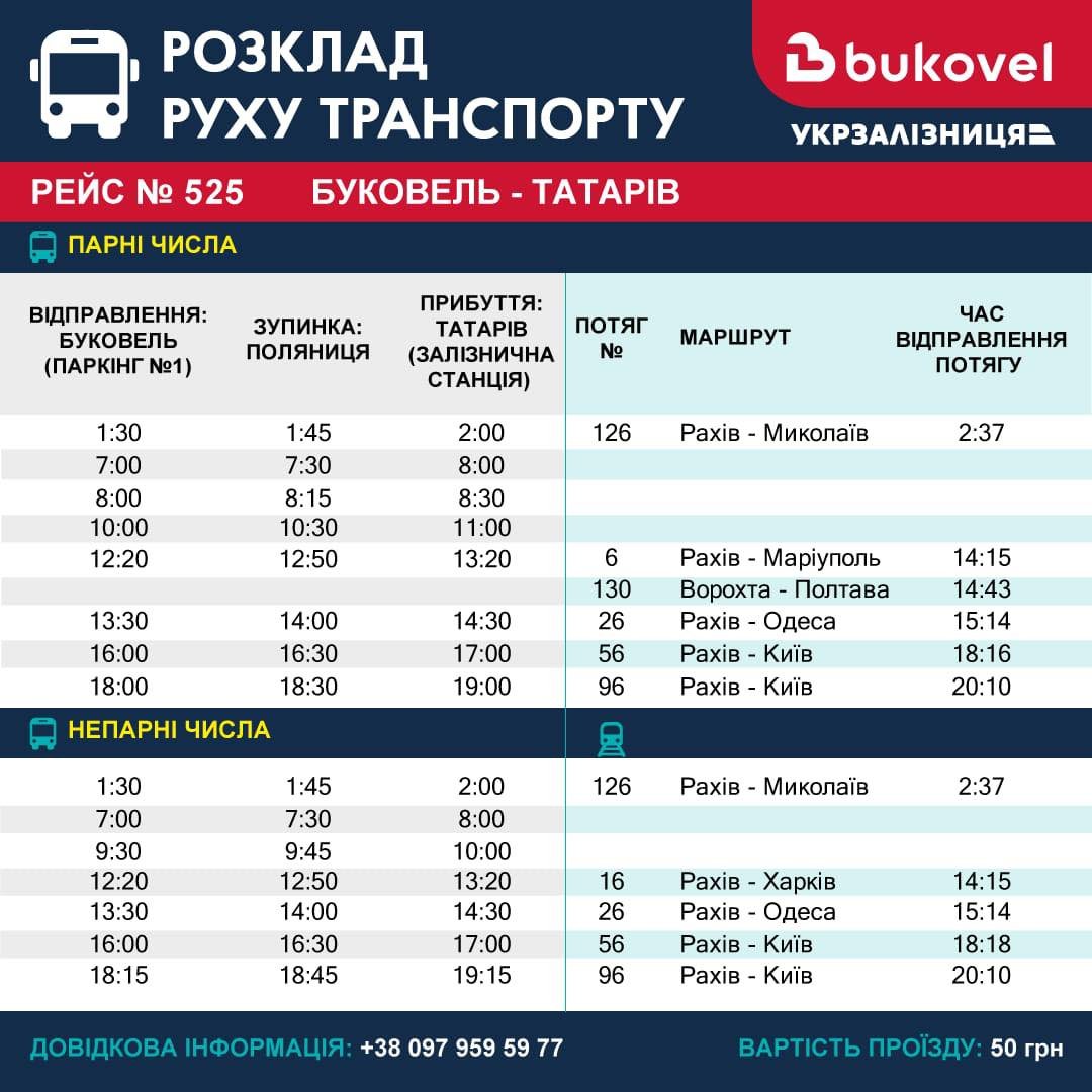 В пресс-центре информируют, что 15 км расстояние от станции "Татаров-Буковель" до горнолыжного курорта автобусы преодолевают за 20 минут, а цена за поездку является фиксированной и составляет 50 грн.