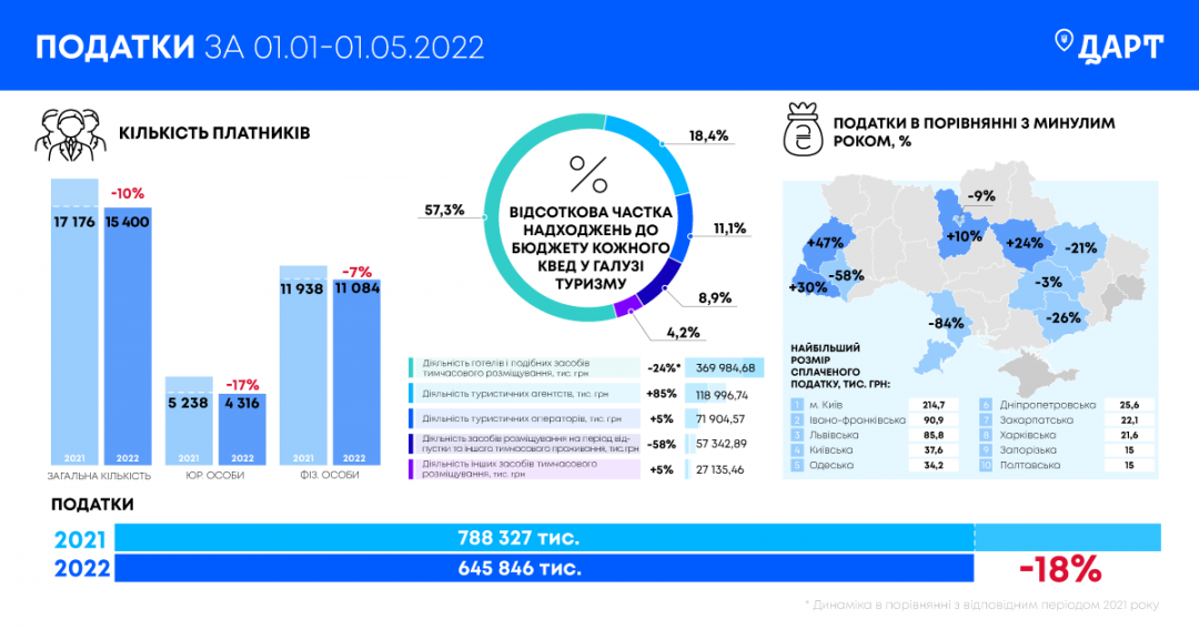 "За первые четыре месяца 2022 года представители туристической отрасли Украины оплатили на 18% меньше налогов, чем за аналогичный период 2021 года. Общее количество налогоплательщиков, занимающихся туристической деятельностью, за первые месяцы войны в среднем сократилась на 10%. Также зафиксировано, что количество юридических лиц уменьшилось на 17%, а физических - на 7%", — привели цифры в ДАРТ.